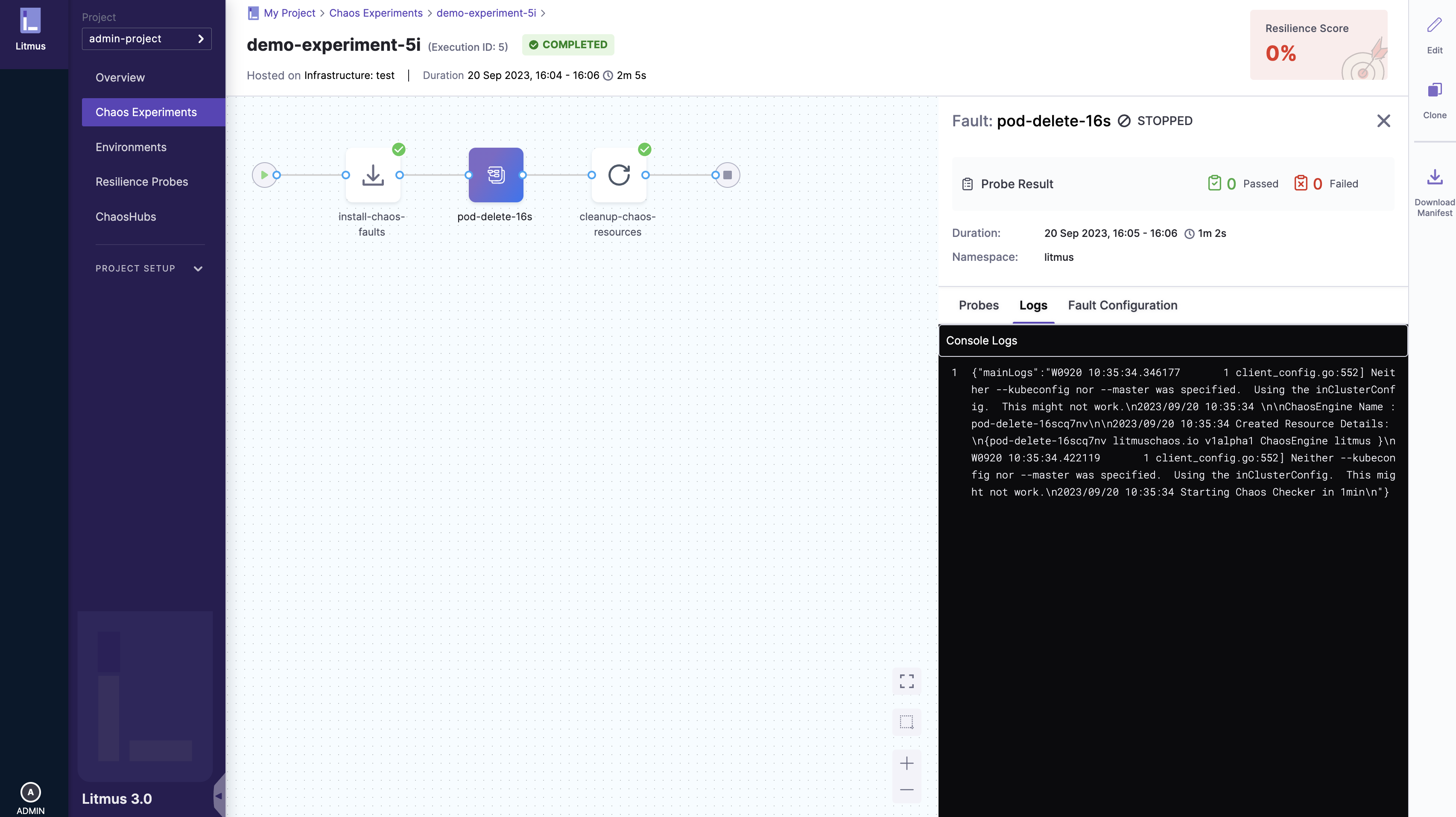 If the user chooses to Save and Run the experiment, they will be redirected directly to the experiment execution page where the experiment execution steps will be visualized, else they will be taken Chaos Experiment Page.